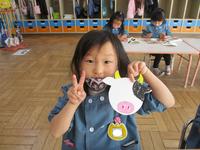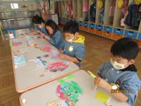 年中組は、月間絵本の付録に色を塗り、オニのお面を作りました。
