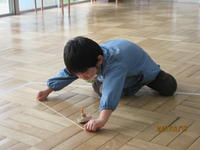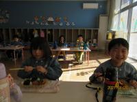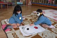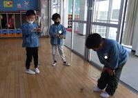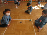 年少・年中組は、年長組がやっているこま回しに憧れて、ひもの巻き方を練習していました。