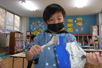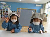年少組は、新聞紙を折ってオニのかぶり物を作りました