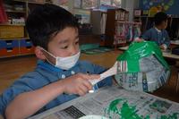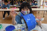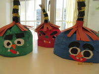 今日は、新聞紙で作った帽子に絵の具で色を塗りました