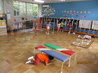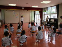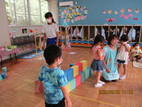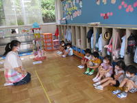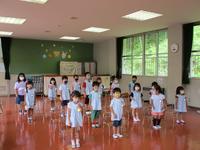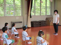 熱中症の暑さ指数が高かったため、戸外に出る時間は短くし、室内で全体指導を行いました。