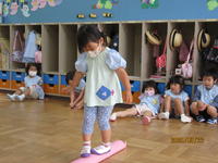 にじ・ほし組さんは、巧技台の一本橋でバランス運動をしました。