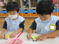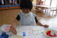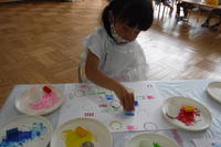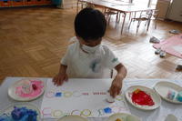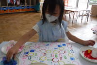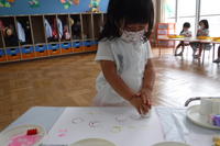 また、年中・年少児は、身近な素材を使ってスタンプ遊びをしました