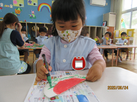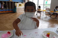ポスターカラーを使ってすいかの色を塗りましたが、初めての経験にも意欲をもって取り組んでいました