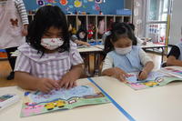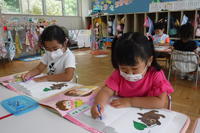 また、「雨をたくさん描いてみよう」というワークブックに取り組んでいた年少組は、「ざあ、ざあ」と声に出しながら描くかわいらしい姿が見られました