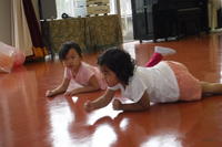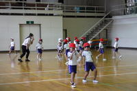 年少・年中組は、遊戯室で全身運動をしてストレッチ