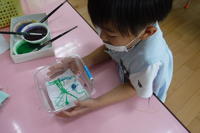 絵の具を付けたビー玉を、和紙の上で転がして模様をつけました。