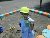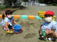 砂場は密にならないよう、3~4人ずつで使用し、遊ぶ前には手の消毒も行っています。