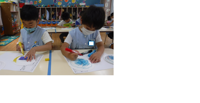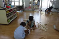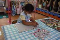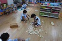 避難訓練の後、そら組さんはフリスビー作りをしました。