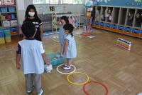 フリスビーの持ち方や、腕の曲げ伸ばしなど、自分なりに投げ方を工夫したり、友達の投げる様子を見て真似したりする姿が見られました
