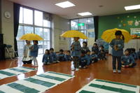 「雨の日はどんなことに気を付けて歩いたら良いのかな?」「正しい傘の使い方ができるかな?」ということについて交通指導員の先生に教えていただきました