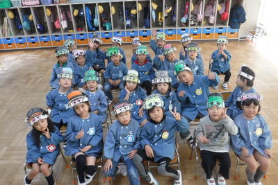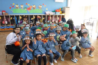 今日はハロウィンということで、自分で作ったお面をかぶって誕生会に参加しました
