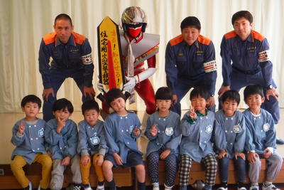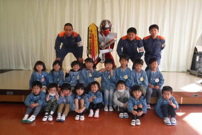 3名の消防士さんと消防戦士住警器マンが湯本第三幼稚園に来てくれました
