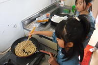 登園後、年長児が豆を炒る仕事を手伝ってくれました