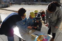 1次避難場所(園庭砂場前)から2次避難場所(サン・アビリティーズ)まで避難をしました。