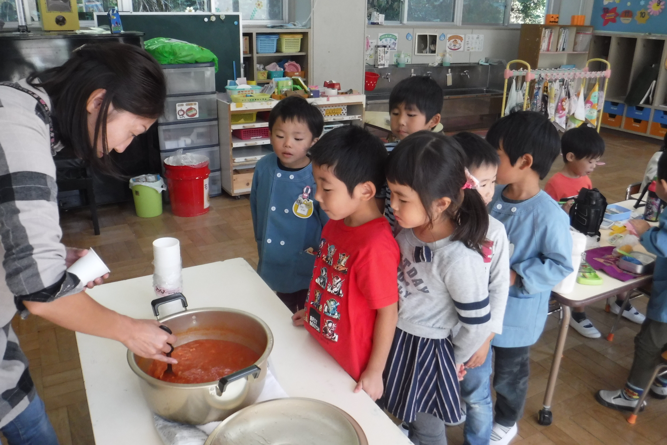 今日は、昼食時に、園で収穫したトマトを使ったミネストローネを食べました