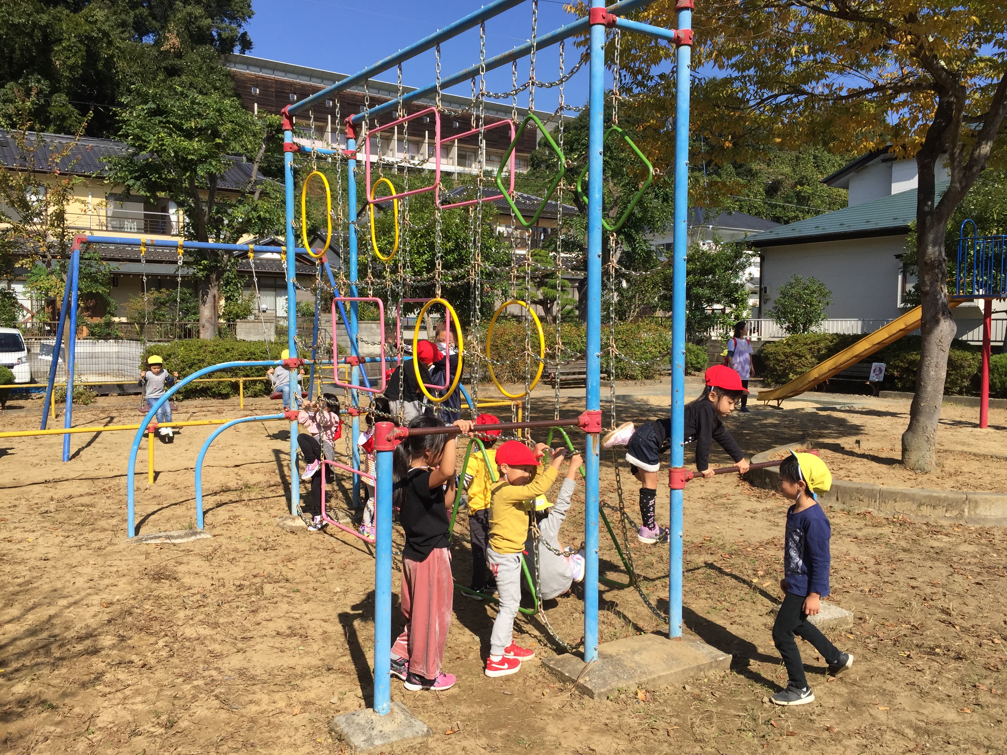 幼稚園にはないような遊具に挑戦したり、どんぐり拾いをしたりしてきました
