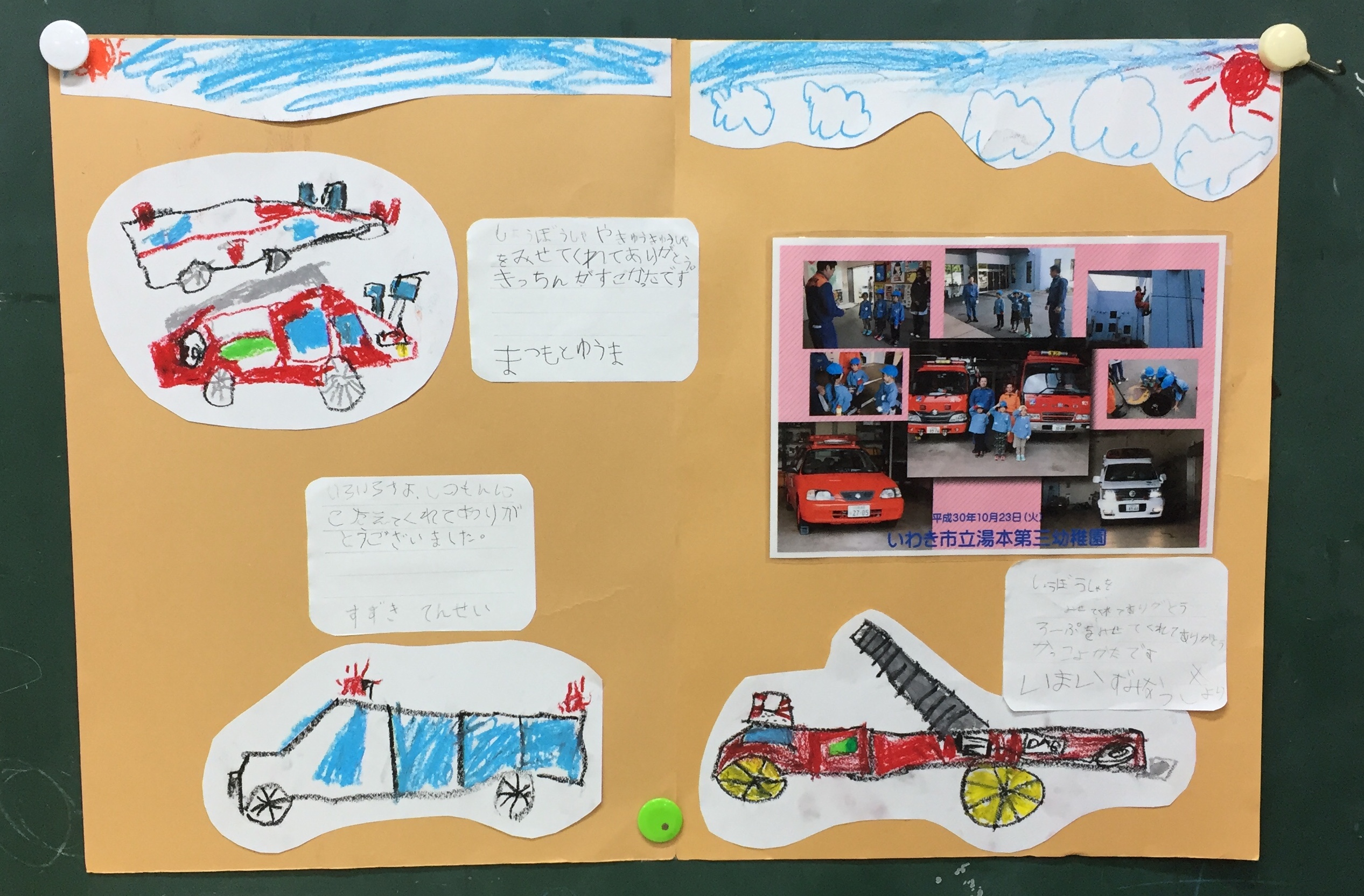 先日の消防署見学でお世話になった常磐消防署の皆さんへ、年長児3名が心を込めてプレゼントを作りました
