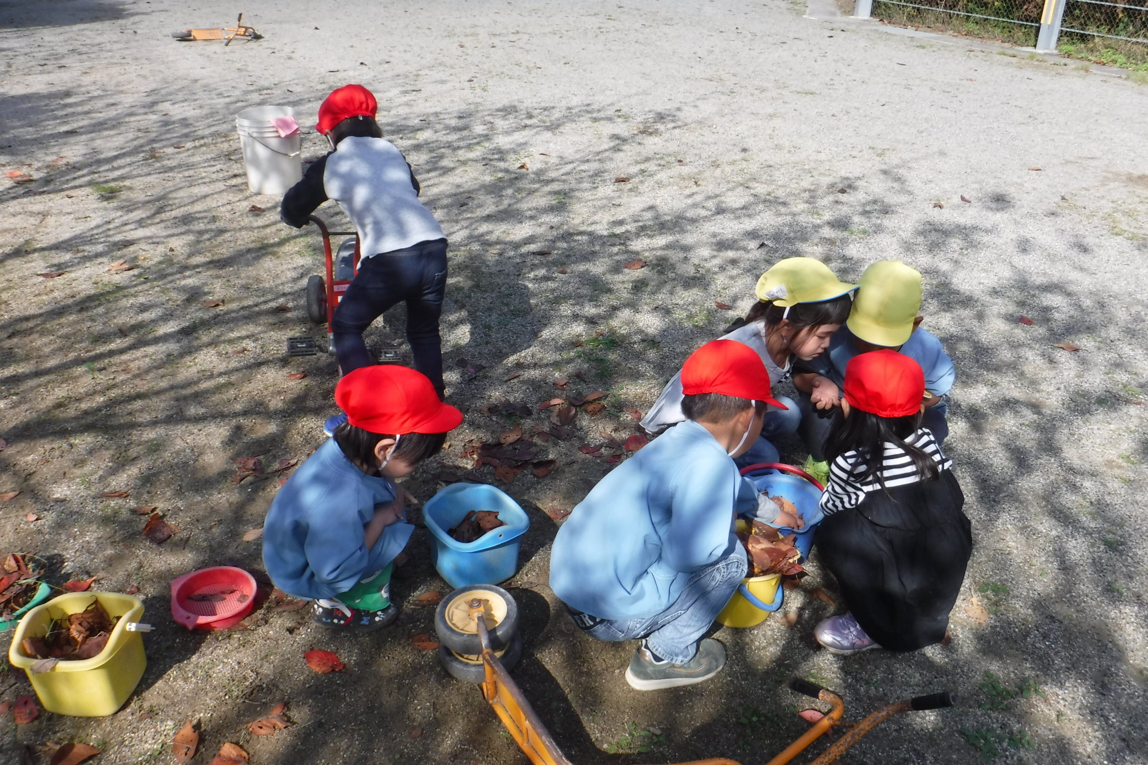 留守番チームの年少・年中組の子供たちは、落ち葉を集めて遊んでいました