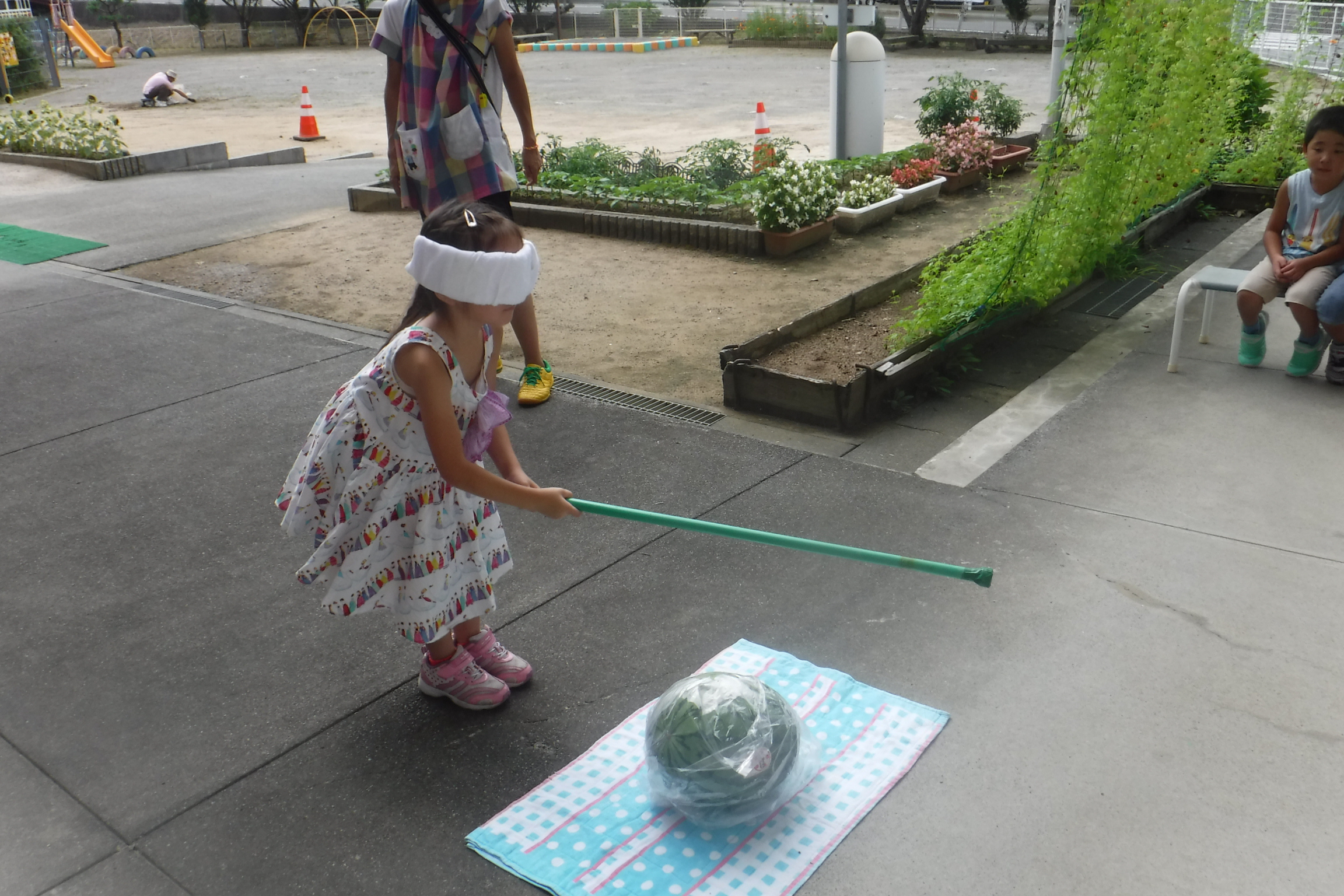 今日のお楽しみコーナーは「スイカ割り」をしました