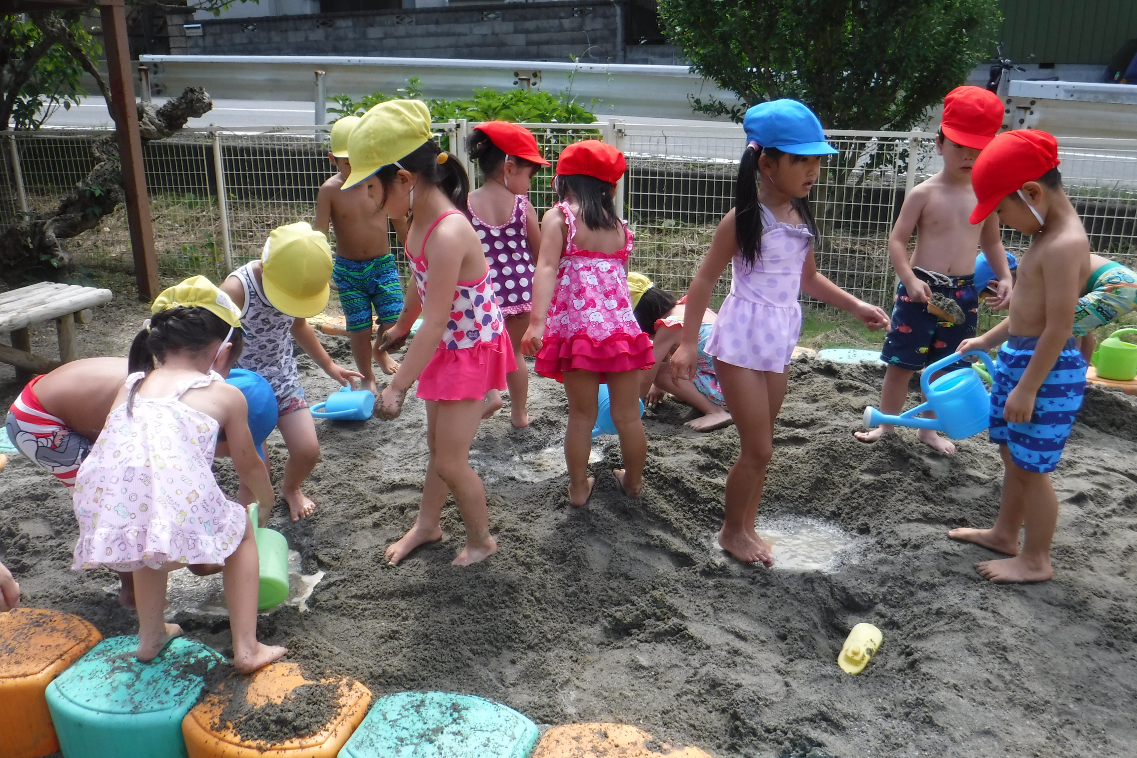 泥んこ遊びをしたり、シャワーで水浴びをしたりしながら、楽しく遊んでいました