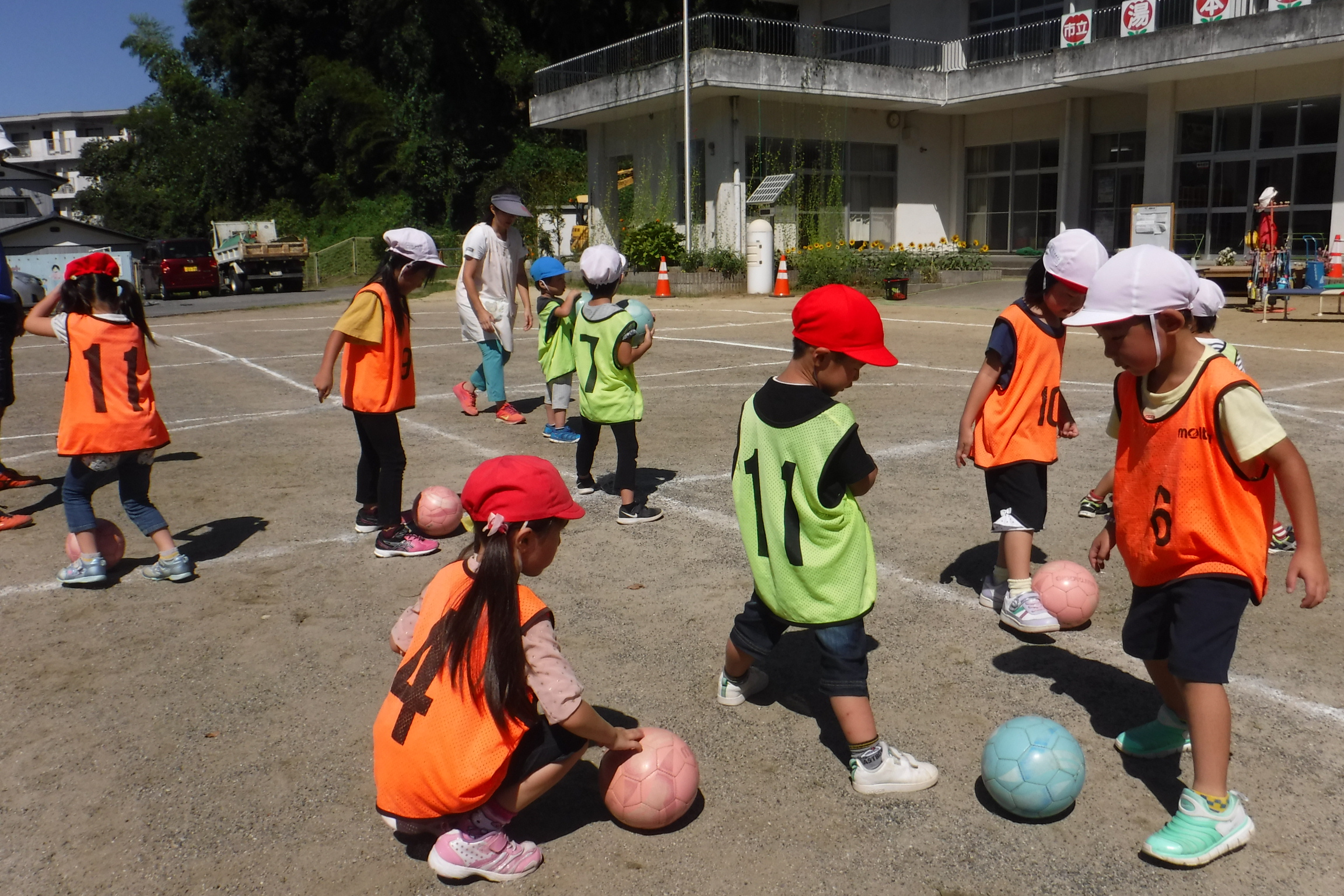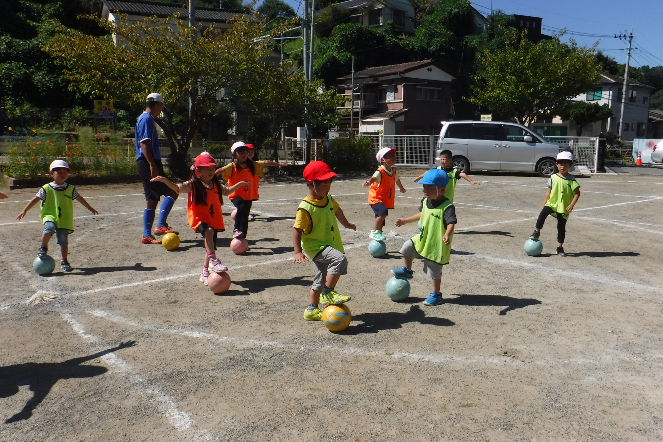 今日は、福島県サッカー協会より2名のコーチに来園していただき、年中、年長児を対象にサッカー教室を行いました