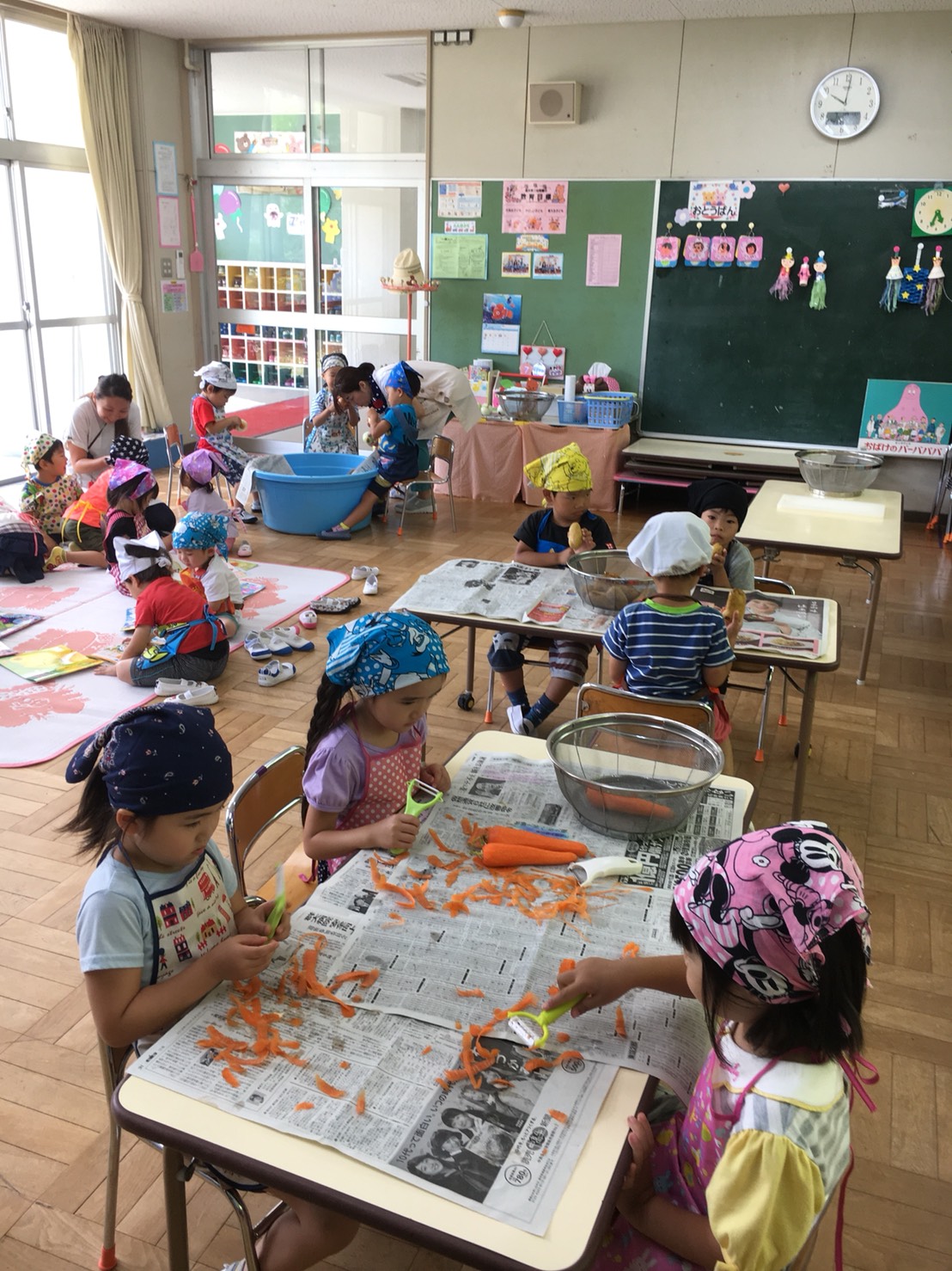 年少児は野菜を洗い、年中児が野菜の皮をむき、年長児が野菜を切りました