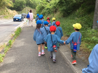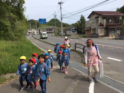 年長さんと年中さんが、年少さんの手をしっかりつないで小学校までリードしてくれました。成長した姿に、先生たち感激! ありがとう。たすかったよ。