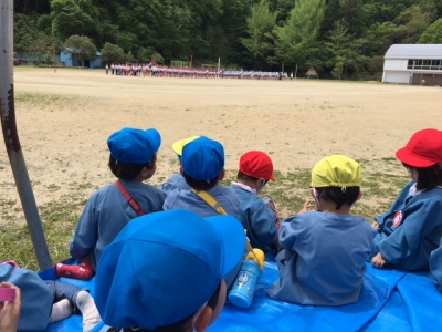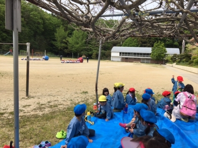 全校生が出てきました。リレーの練習だそうです。「リレーってなあに可愛い年少さんの質問に「走るやつだよ。」「運動会にやったでしょ」「あっ、年少さんはいなかったわ」「見てな。今やるからね。」可愛い子ども達の会話でした。