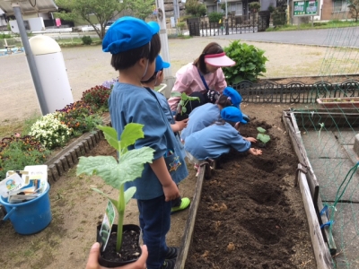 年長組が、キュウリの苗植えに挑戦です。昨年の経験からとっても上手に植えました。