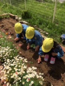 年少組のにじ組さんは、コスモスの種をまきました。初めての経験でしたが、