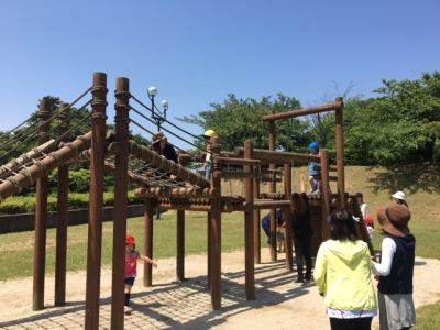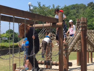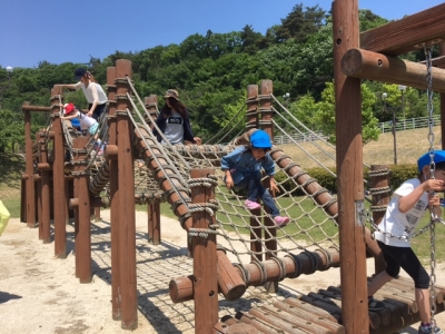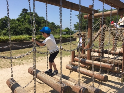 バスに乗って着いたら、トリムランドで思いっきり遊びました。お母さんと一緒です
