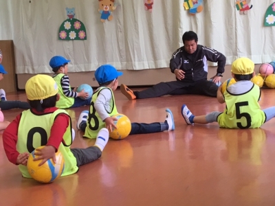 まずは柔軟。ボールを使って、体を動かす準備です。