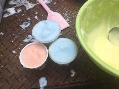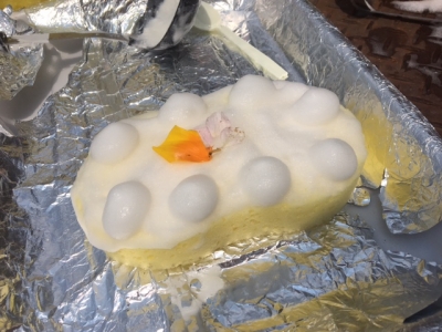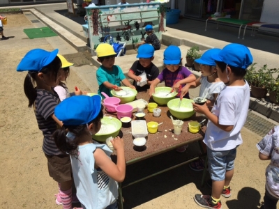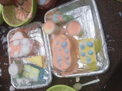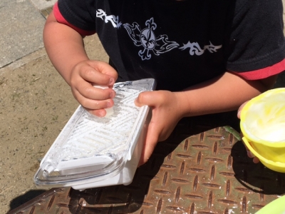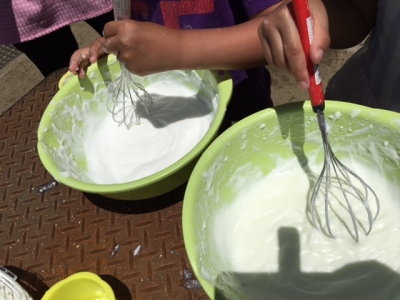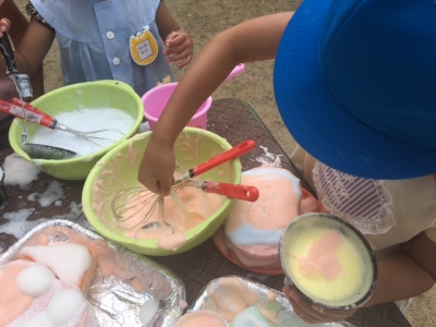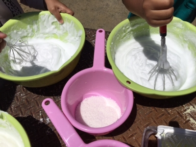 シャボン玉遊びも楽しいけれど、年長さんは、石鹸メレンゲ遊びに挑戦です。