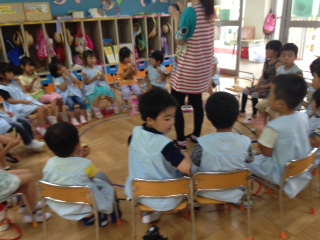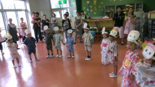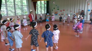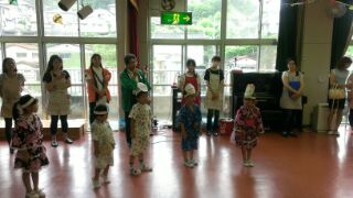あいにくの雨で遊戯室での踊りとなってしまいましたが、子どもたちは、ドラえもんとドラミちゃんのお面をつけて、元気一杯に踊りました\(^o^)/