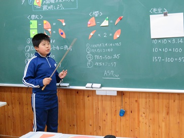 今日は、6年生児童2名が、円の面積の応用問題の解決方法を説明していました。