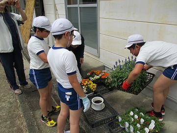 今日、3校時目に、セブンイレブンからいただいた花苗をプランターに植え替える作業に取り組みました。
