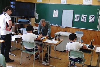 2018年5月30日 10時50分今日は、学校近くにお住いの山野先生に来ていただいて、習字の七夕展の作品作りに取り組みました。