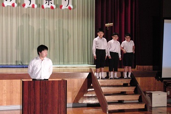 最後に、本校の3名の児童が、白水小学校への思いをまとめた作文を発表しました。子どもたちの立派な作文発表の後、感動が会場をつつみこみ、拍手が鳴りやみませんでした。また、感動のため、その後の校歌斉唱では、声につまってしまう思いでした。