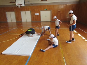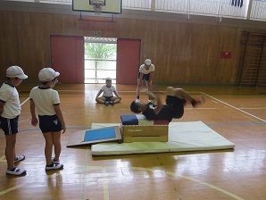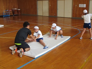 マット運動や跳び箱運動では、基本となる動き方のコツを演示をしていただき、分かりやすく教えていただきました。今までできなかった技ができるようになった子どももいました。また、今までよりも上手にできるようになった子もいました。