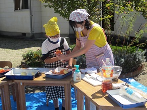 まず、早目に焼き芋をつくって、休み時間にみんなで食べました。焼きたての焼き芋をとってもおいしくいただきました。「皮もおいしい。」と言いながら、子どもたちはペロリとさつまいもを1本食べ、その後、ごはんと味噌汁とカレーに分かれて調理開始。