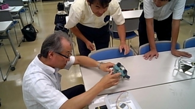 現行の学習指導要領から新学習指導要領への変更のポイントを踏まえながら、育成する問題解決の能力について実際の授業映像などを見せていただきながらお話していただきました。 後半は、実験を交えながら、「主体的・対話的で深い学び」に向けて学ぶことができました。目の前で温められたインクの水の色が変化します。その驚きや疑問から学びが連続していくことを教えていただきました。参加した先生方も実験をとおして実感しながら学んでいました。