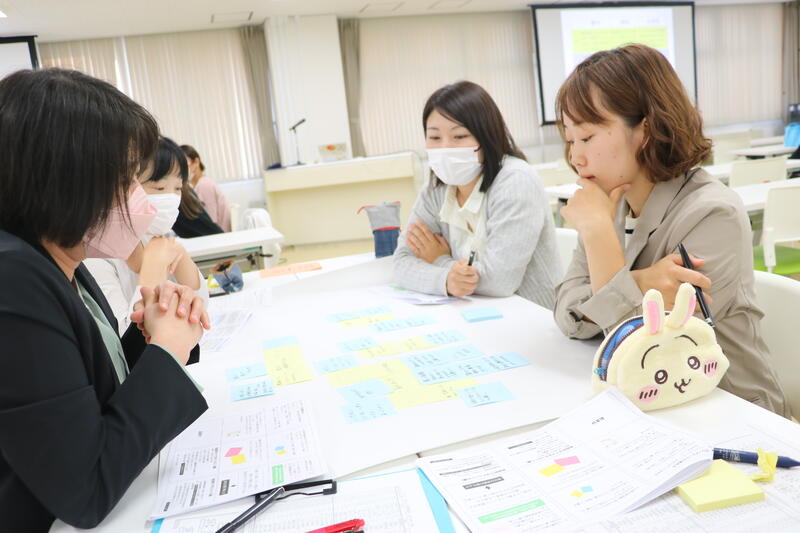 次に、架け橋プログラムに基づく演習が行われました。各校種の意見が交流しやすいように構成された4~5名のグループごとに、「主体性」「困り感」等のテーマで語り合いました。テーマごとに設定された問いに対する解決策を求めて、各校種の先生方が現場での実践をもとに意見を出し合いました。