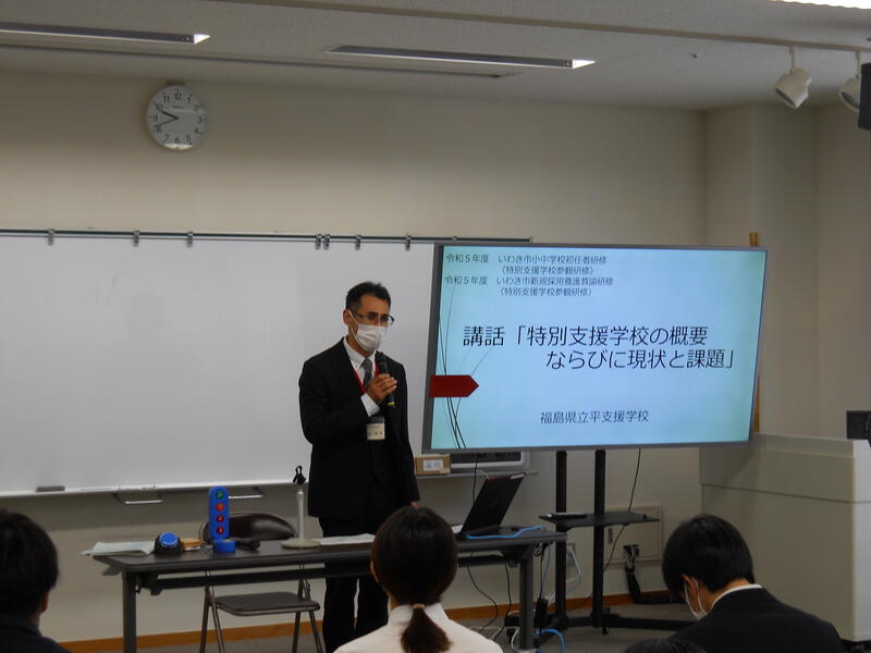 いわき支援学校では、児童生徒の授業の様子を参観させていただいた後、菅野教頭先生から講話「特別支援学校の概要説明」、中学部特別支援教育コーディネーターの古川先生から講話「特別支援教育の視点を生かした学級経営」でお話をいただきました。