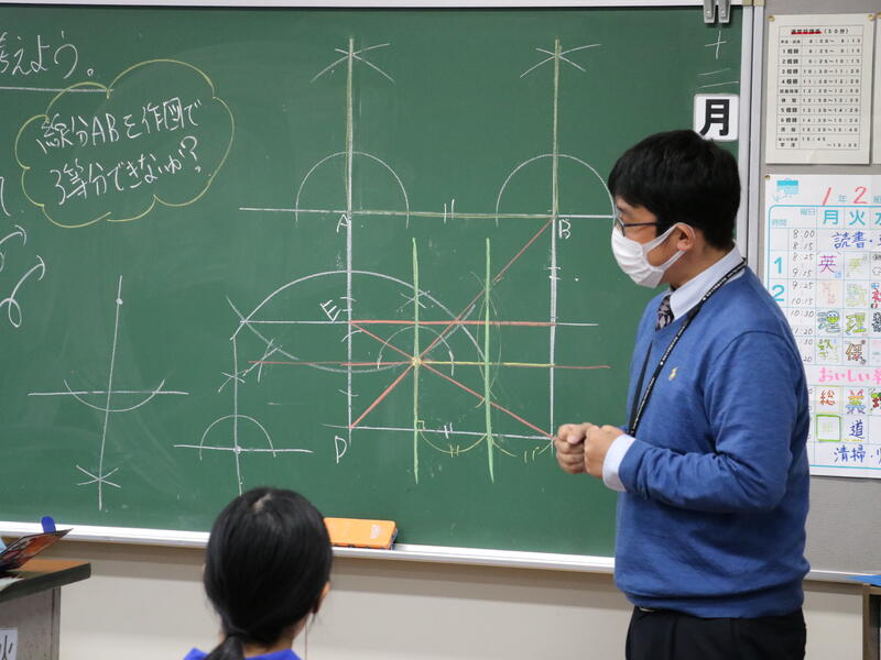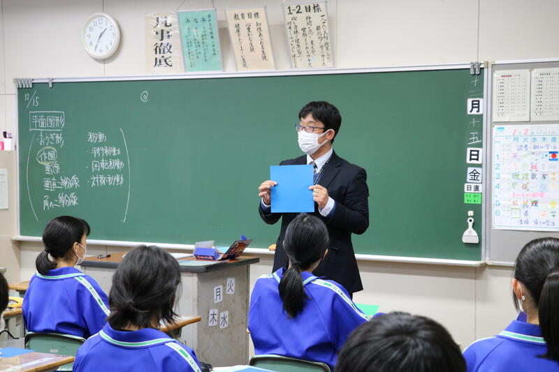 「『主体的・対話的で深い学び』の視点からの授業改善」をテーマに、筑波大学附属中学校の石黒友一先生を講師として招聘し、1年生の「平面図形」の授業を行っていただいたり、授業後に授業についての協議や授業の在り方についての講義をいただいたりしました。