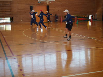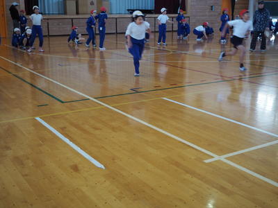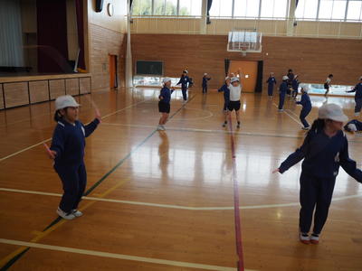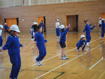 2年、体育「リズム遊び」。冬休みの課題でもある「なわとび」に挑戦です。