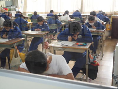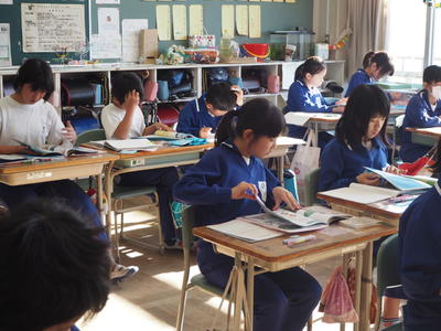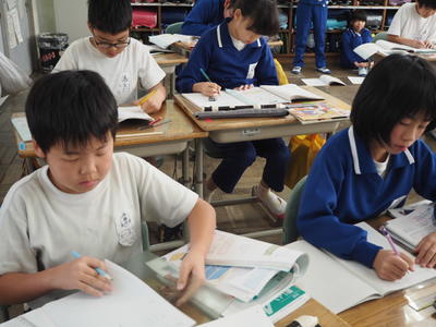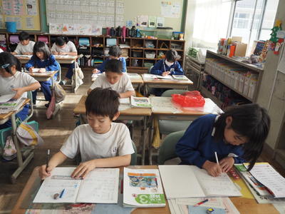 4年、書写「書き初めをしよう」。家でお正月に書き初めをするための練習をしています。