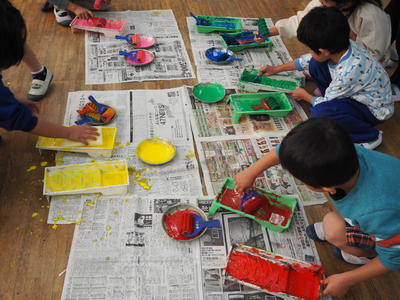 1年、図工「コロコロ ぺったん」。身近にある材料・用具,ローラーや手などを使って形を写すことを楽しんでいます。