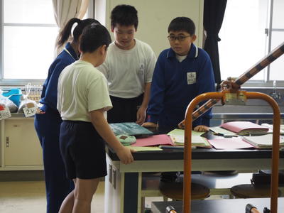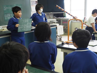 6年、理科「てこのはたらき」。てこが水平につり合うときの決まりや、力の大きさと支点からの距離などについて班でまとめたことを発表しています。