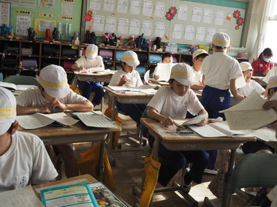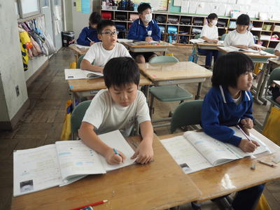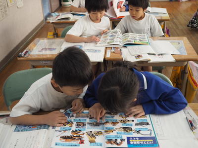 3年、国語「たから島のぼうけん」。できた作品を読み返し,文字の間違い,記号の使い方,主語と述語,文のつながりなどの間違いを正したり,よりよい表現に書き直したりしていました。